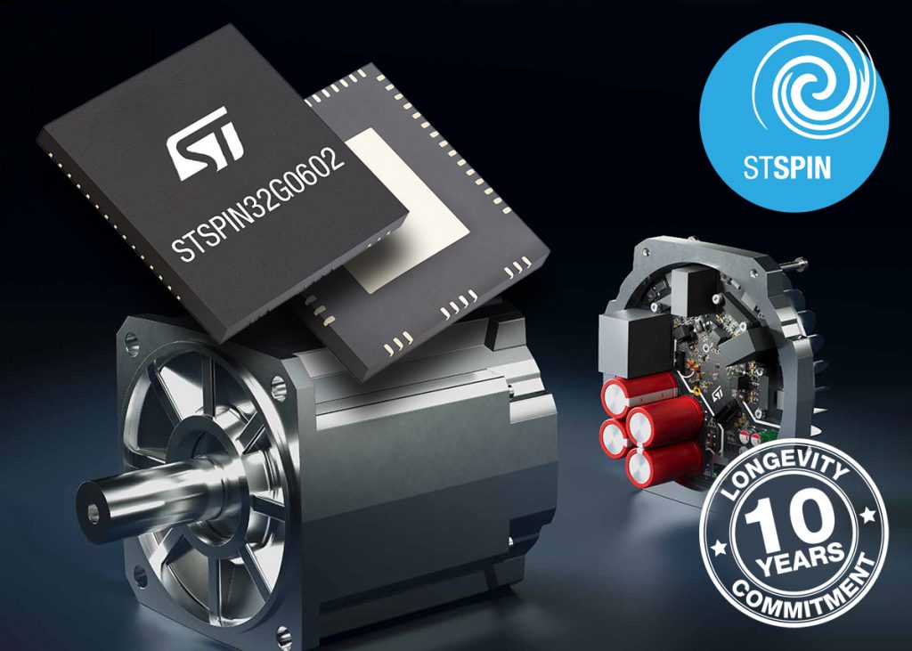 The integrated STSPIN32G0602Q controller combines a high-voltage three-phase gate driver with a 32-bit STM32G0 microcontroller in one package. This system-in-package approach streamlines the design of industrial motor drives by reducing component count and ensuring tight integration between control and power stages. The single-chip solution enables designers to build more compact applications such as industrial pumps, fans, factory automation equipment, and servo systems.
