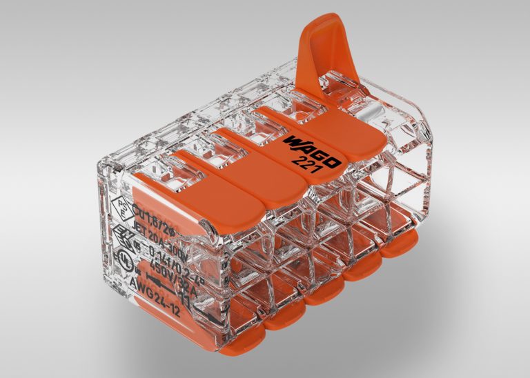 The 221-420 ten-conductor lever splicing connector from WAGO delivers secure, tool-free terminations for lighting, junction boxes, heating and ventilation equipment, and low-voltage power distribution.